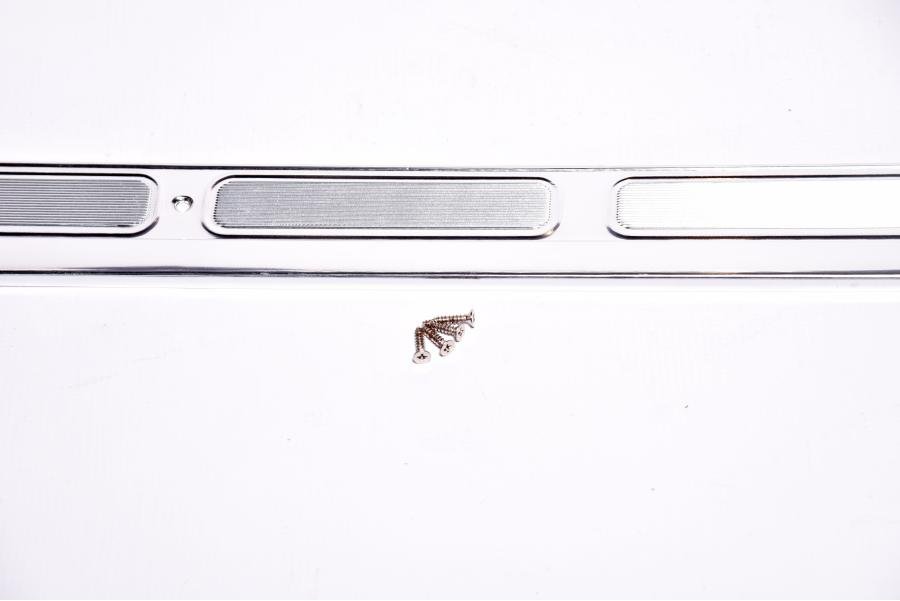 Instructions: Remove the old sill plate by unscrewing the factory mounting fasteners. Clean the door sill area to remove debris and rust. Position the new sill plate over the factory mounting holes and secure it in place using the provided or original screws. Adjust as needed before final tightening.
