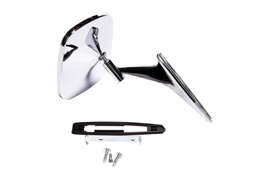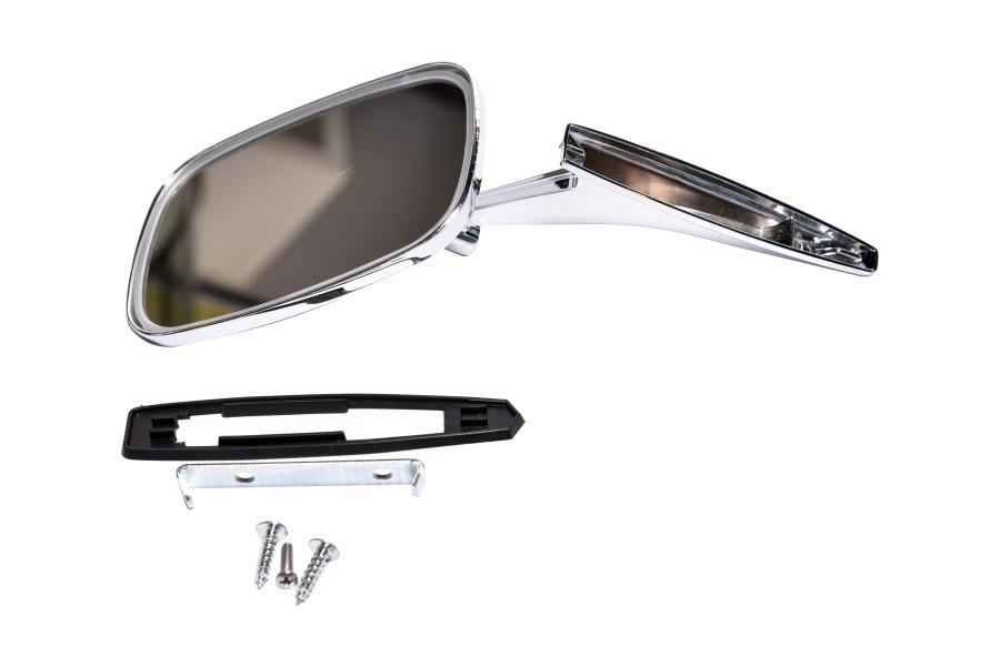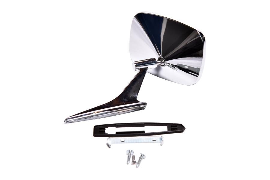 The 1968-1974 GM Car Right Hand Outside Door Mirror with Rib Design is a high-quality reproduction designed to match the factory-installed passenger-side mirror on a wide range of GM vehicles from the late '60s to mid-'70s. Featuring the iconic ribbed base styling, this mirror offers a polished chrome finish and durable construction for long-term use. The mirror head is manually adjustable to provide enhanced visibility and safer lane changes. Whether replacing a missing mirror or completing a matched set with the driver's side, this piece offers an authentic appearance and easy installation.