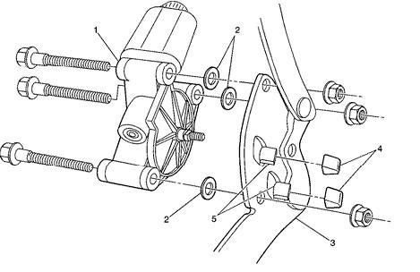 - Install one washer between the left headlamp door motor/actuator and the mounting bracket at each of the three attaching bolt locations.